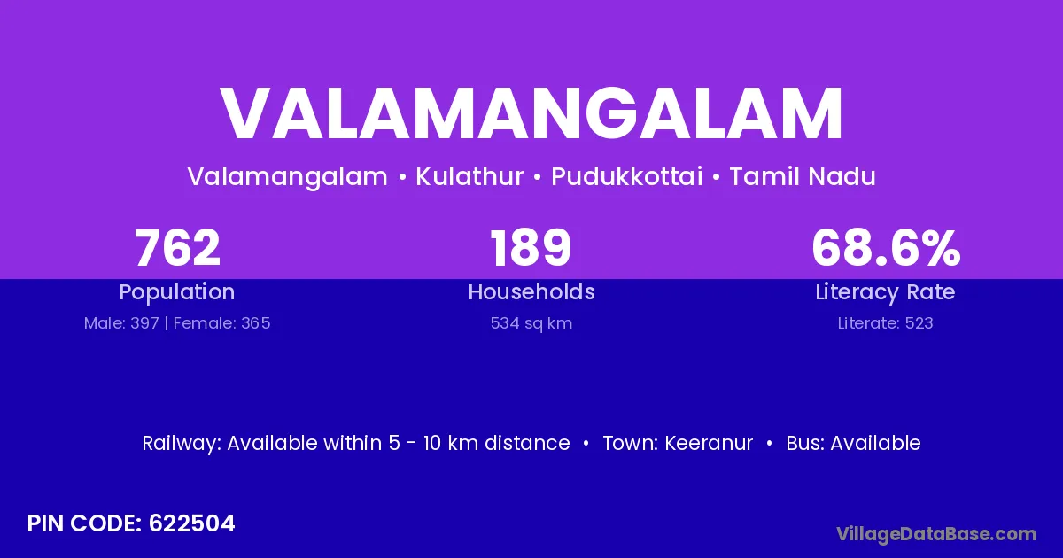 Valamangalam village has a total population of 762 people, of which 397 are males and 365 are females.