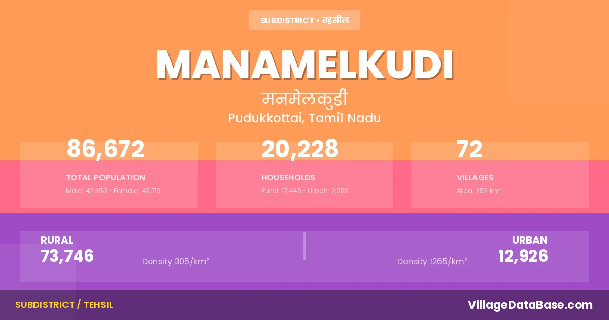 According to the 2011 census The total area of Manamelkudi Taluka is 252 km², with a population of 86672 people. The population density is 344 inhabitants per square kilometre, and there are approximately 20228 houses in the sub district.