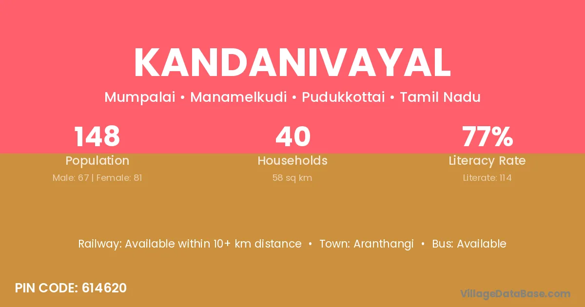 Kandanivayal village has a total population of 148 people, of which 67 are males and 81 are females.