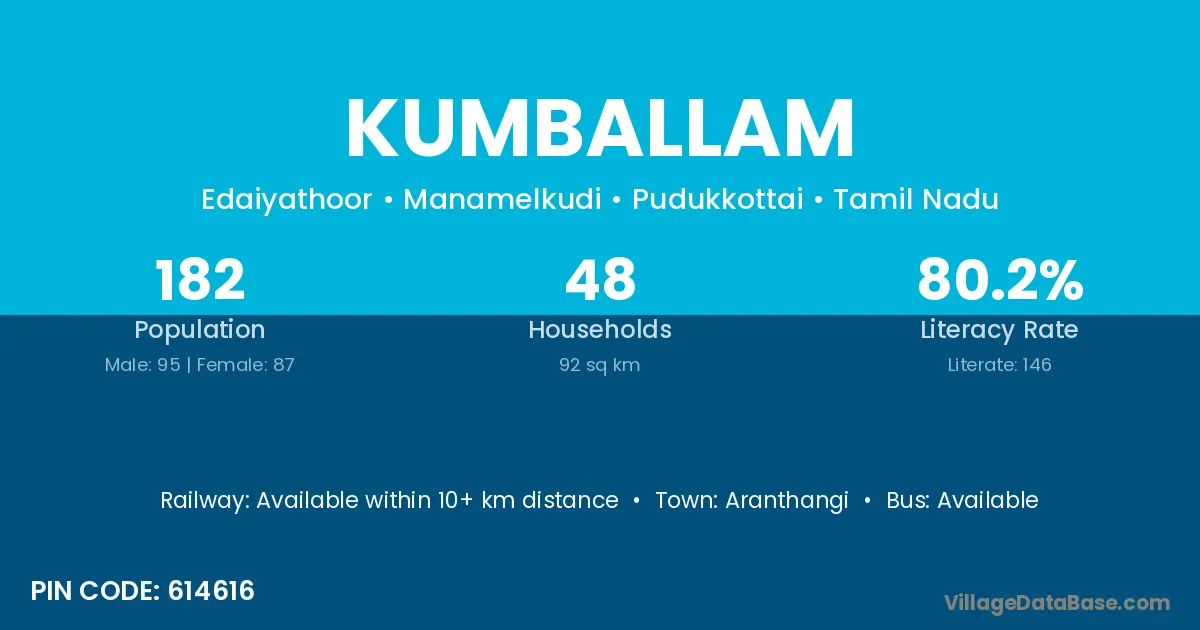 Kumballam village has a total population of 182 people, of which 95 are males and 87 are females.