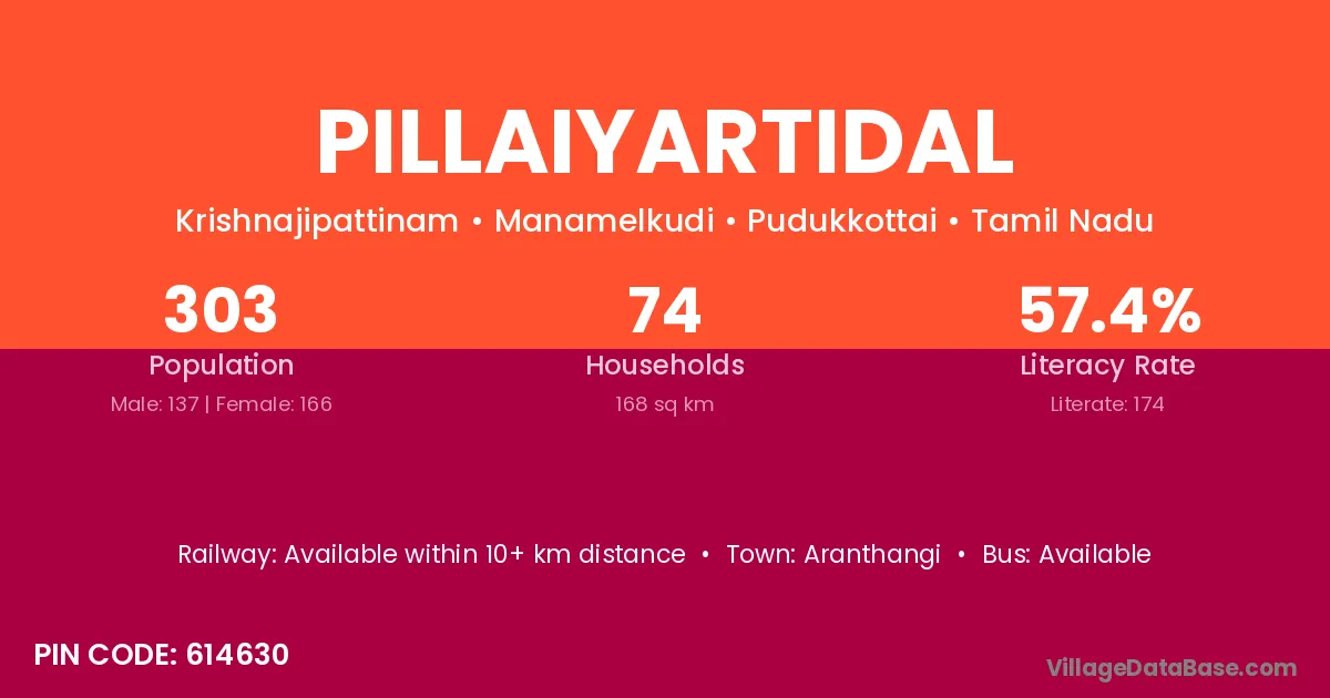 Pillaiyartidal village has a total population of 303 people, of which 137 are males and 166 are females.