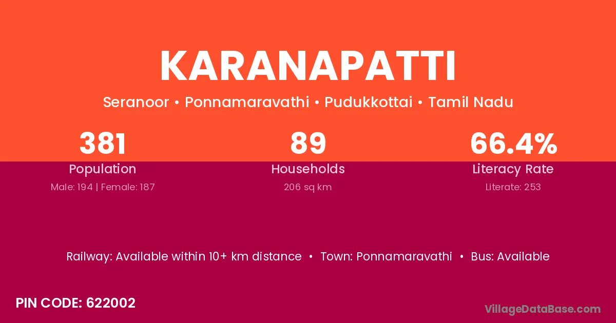 Karanapatti village has a total population of 381 people, of which 194 are males and 187 are females.