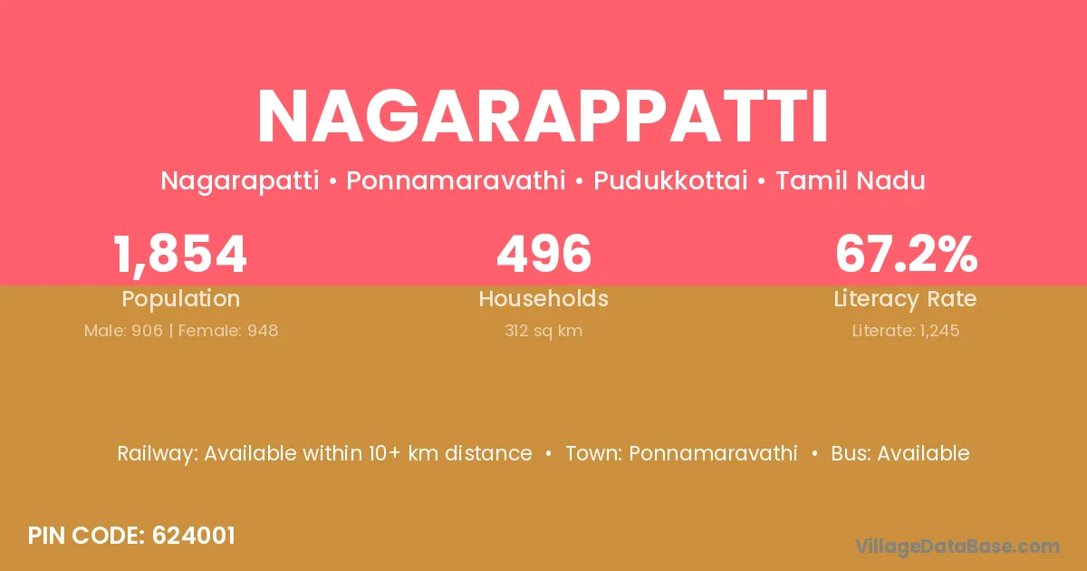 Nagarappatti village has a total population of 1,854 people, of which 906 are males and 948 are females.