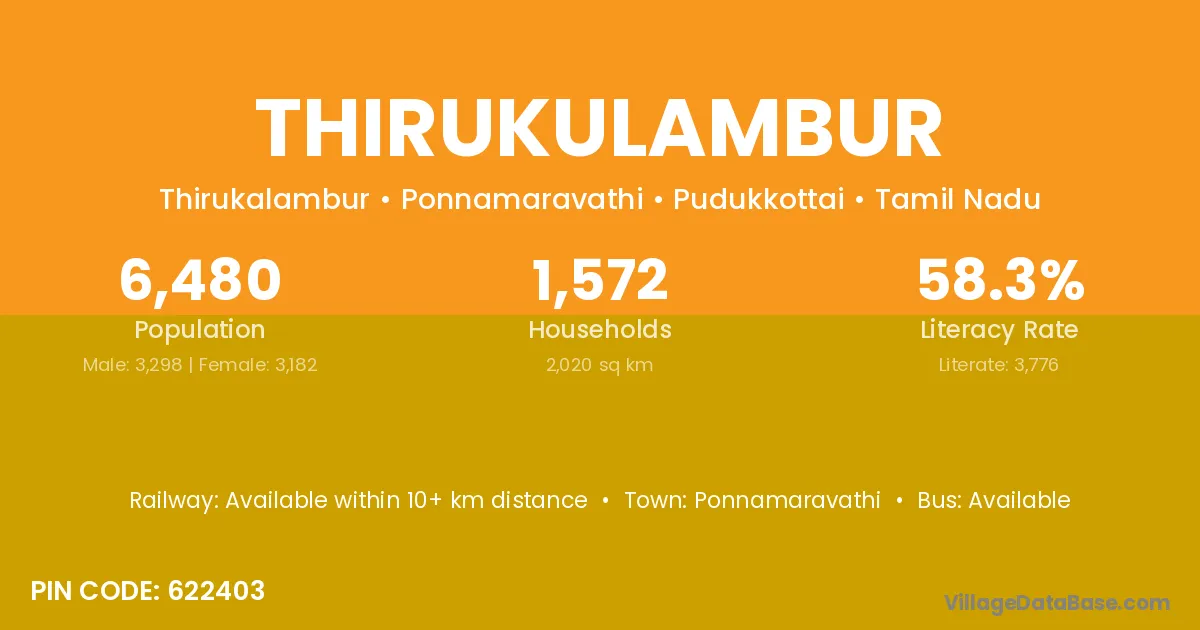 Thirukulambur village has a total population of 6,480 people, of which 3,298 are males and 3,182 are females.