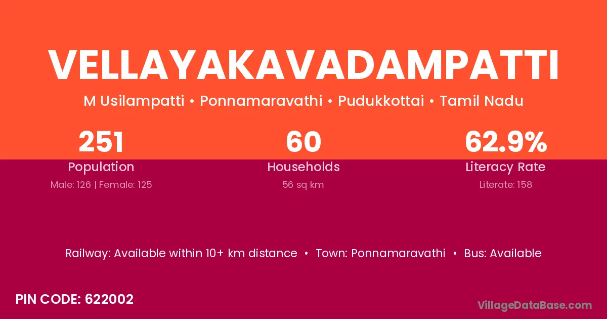 Vellayakavadampatti village has a total population of 251 people, of which 126 are males and 125 are females.