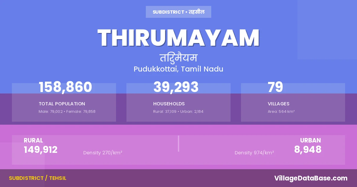 According to the 2011 census The total area of Thirumayam Taluka is 564 km², with a population of 158860 people. The population density is 282 inhabitants per square kilometre, and there are approximately 39293 houses in the sub district.