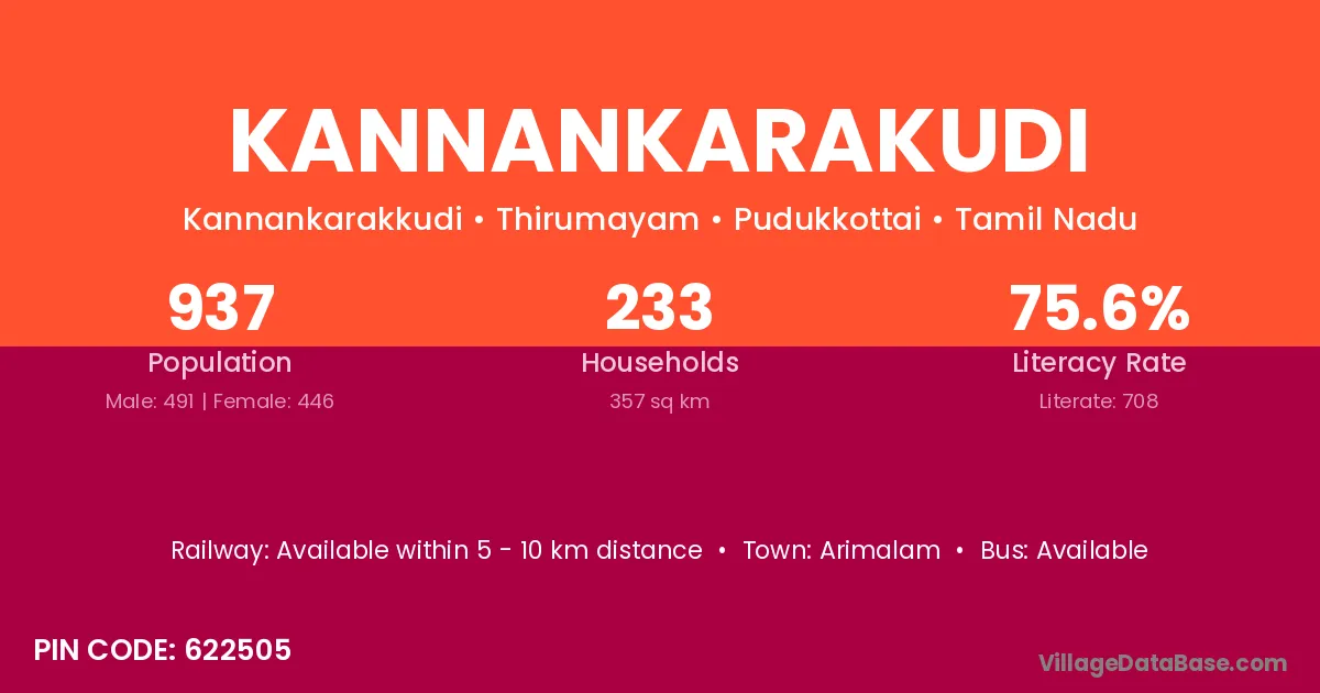 Kannankarakudi village has a total population of 937 people, of which 491 are males and 446 are females.