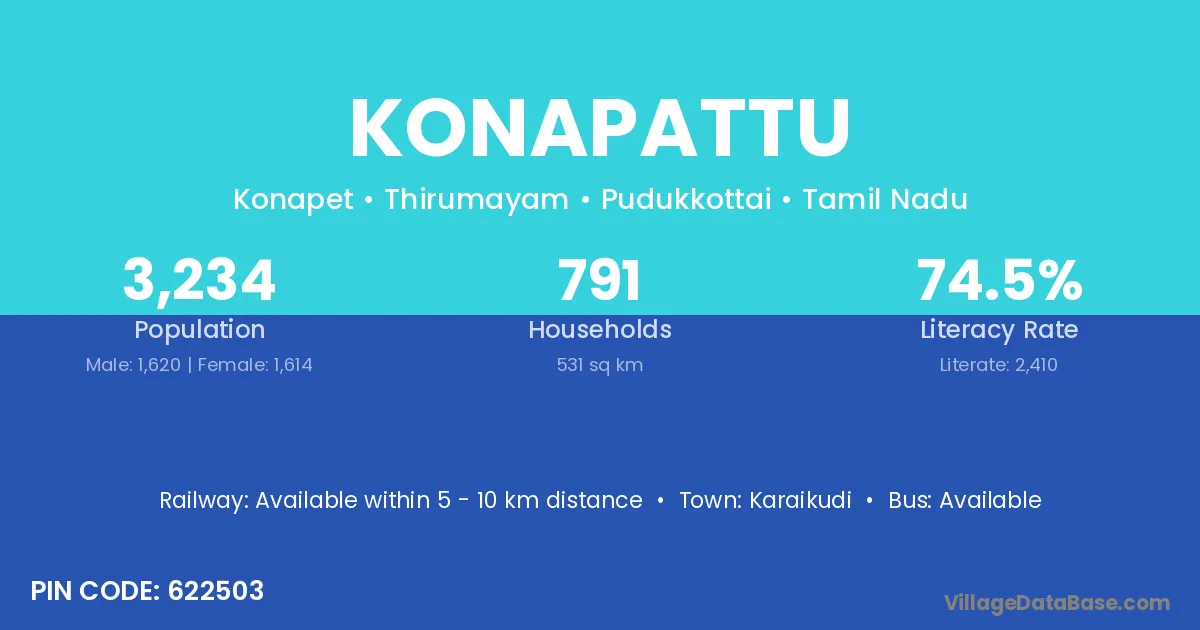 Karaikudi is the nearest town to Konapattu village for major economic activities