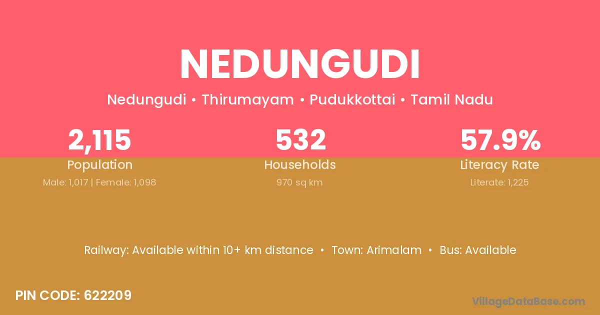 Nedungudi village has a total population of 2,115 people, of which 1,017 are males and 1,098 are females.
