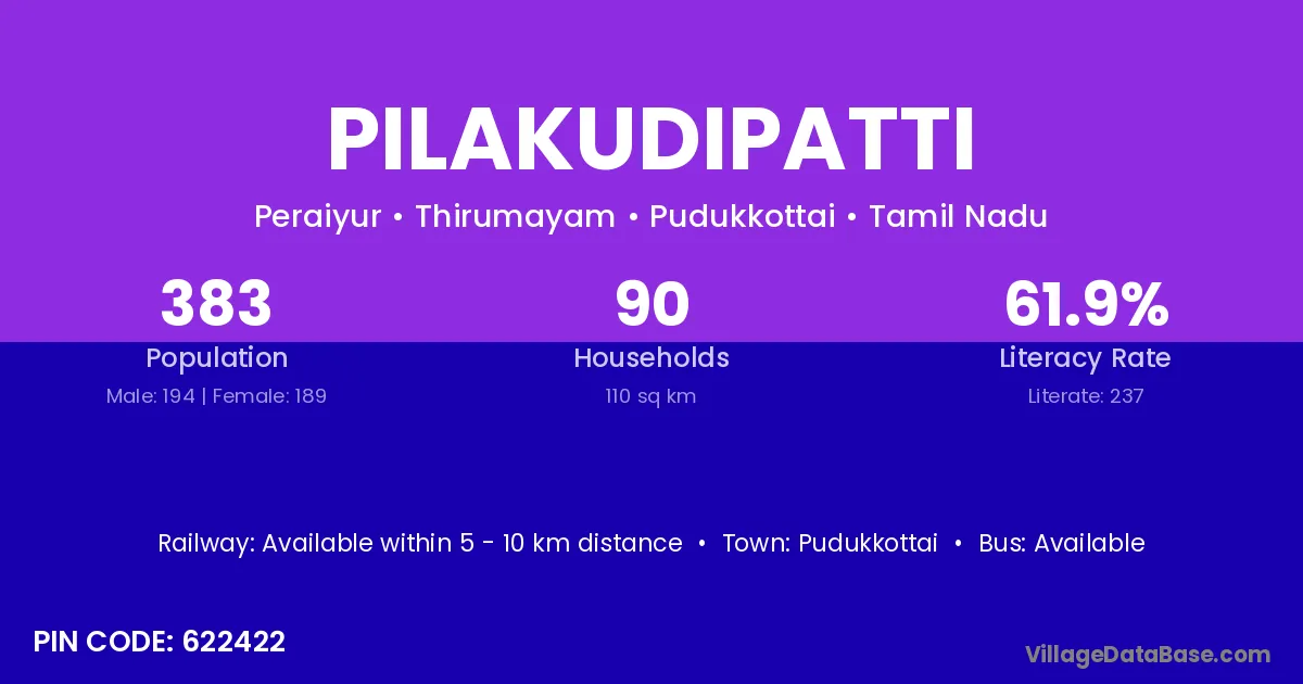 Pilakudipatti village has a total population of 383 people, of which 194 are males and 189 are females.