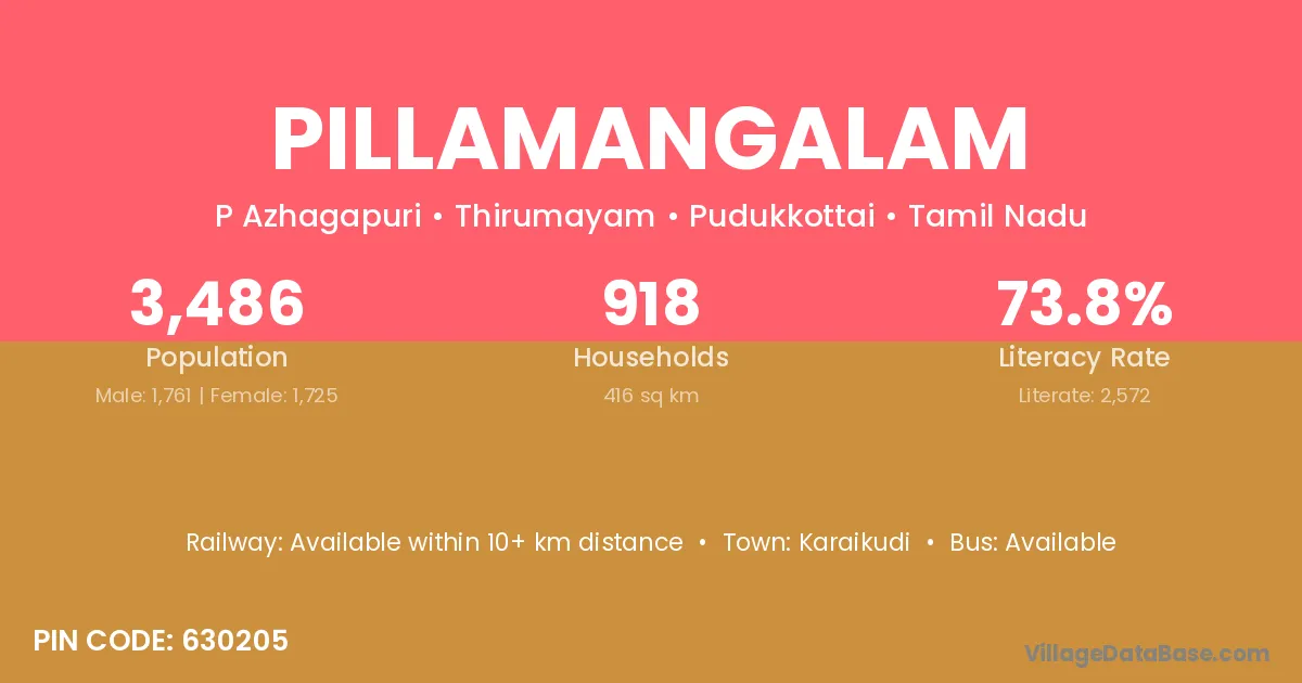 Pillamangalam village has a total population of 3,486 people, of which 1,761 are males and 1,725 are females.