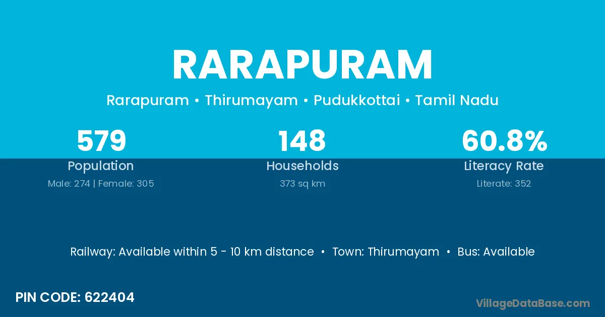 Rarapuram village has a total population of 579 people, of which 274 are males and 305 are females.