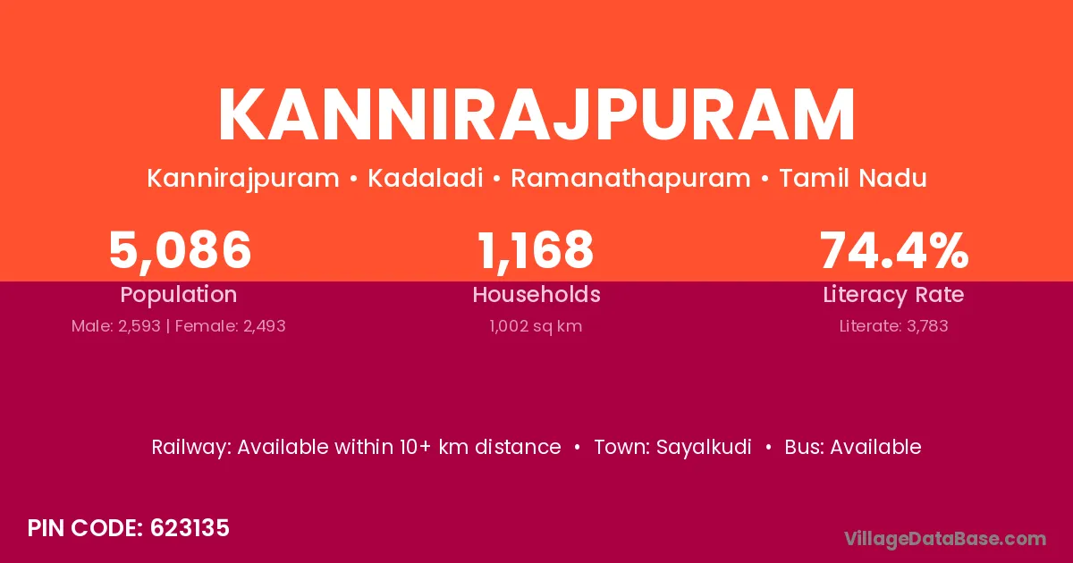 Kannirajpuram village has a total population of 5,086 people, of which 2,593 are males and 2,493 are females.