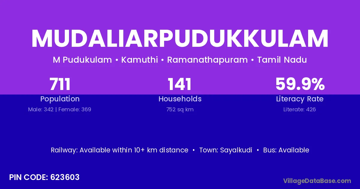 Mudaliarpudukkulam village has a total population of 711 people, of which 342 are males and 369 are females.