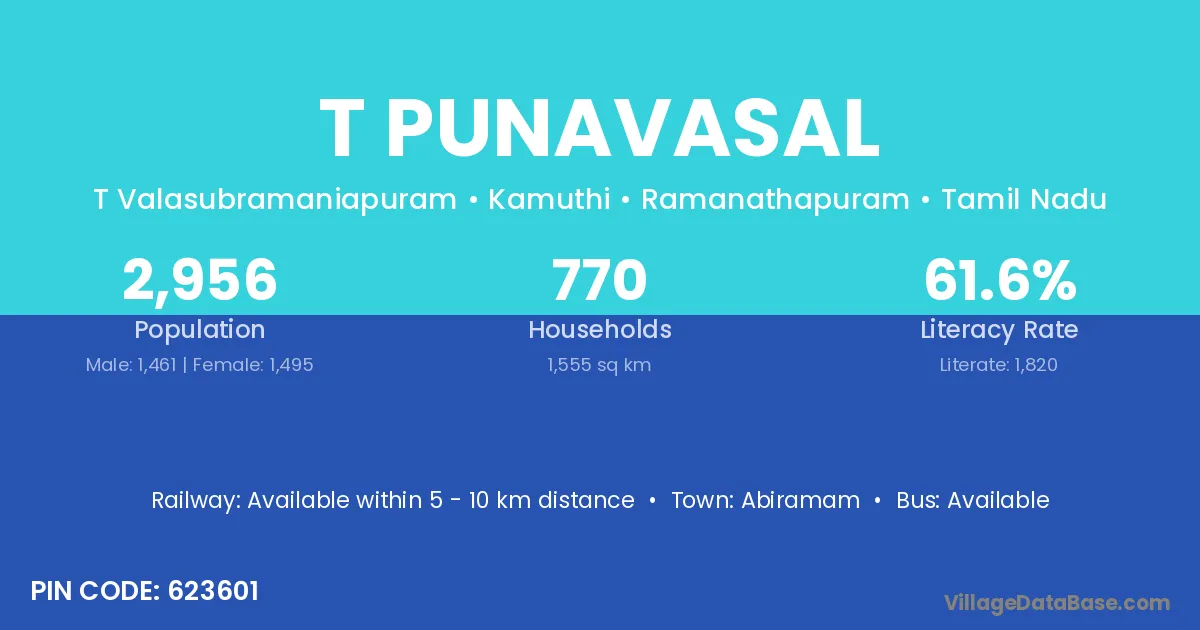 Abiramam is the nearest town to T Punavasal village for major economic activities
