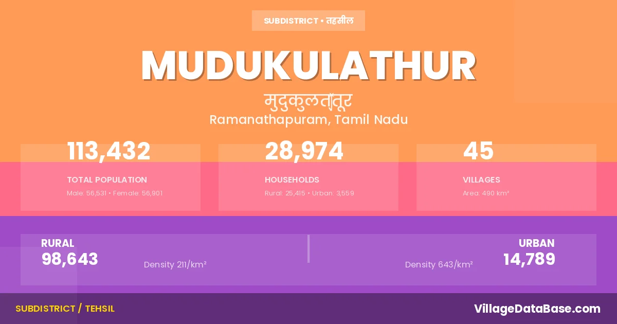 According to the 2011 census The total area of Mudukulathur Taluka is 490 km², with a population of 113432 people. The population density is 232 inhabitants per square kilometre, and there are approximately 28974 houses in the sub district.