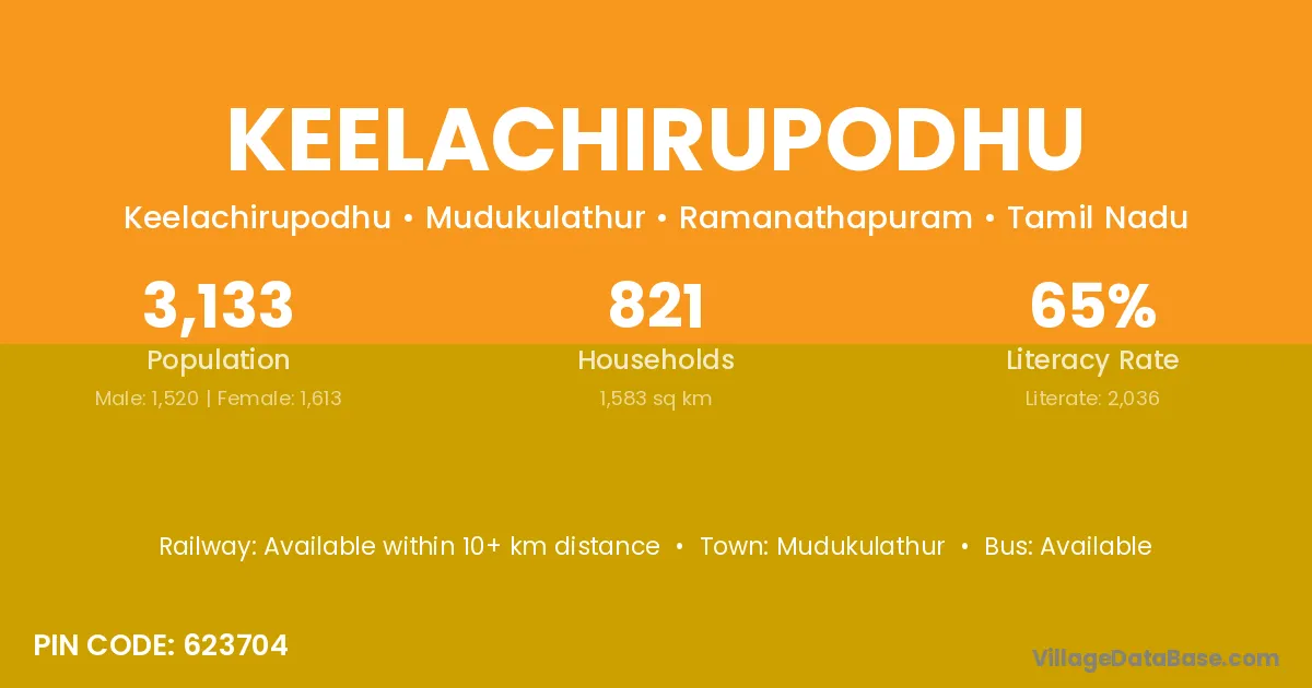 Keelachirupodhu village has a total population of 3,133 people, of which 1,520 are males and 1,613 are females.