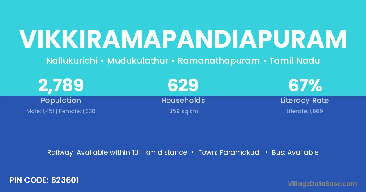 Paramakudi is the nearest town to Vikkiramapandiapuram village for major economic activities