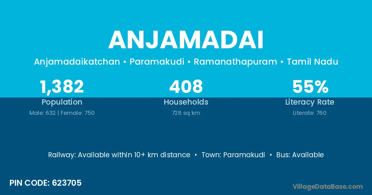 Anjamadai village has a total population of 1,382 people, of which 632 are males and 750 are females.