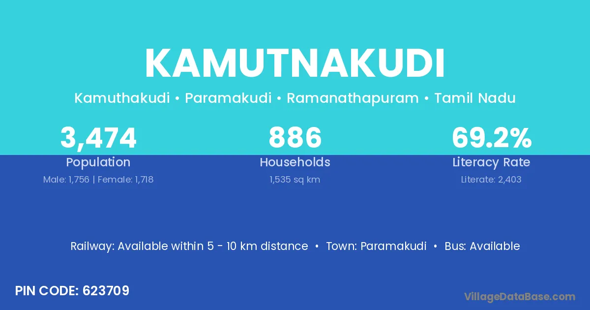 Kamutnakudi village has a total population of 3,474 people, of which 1,756 are males and 1,718 are females.