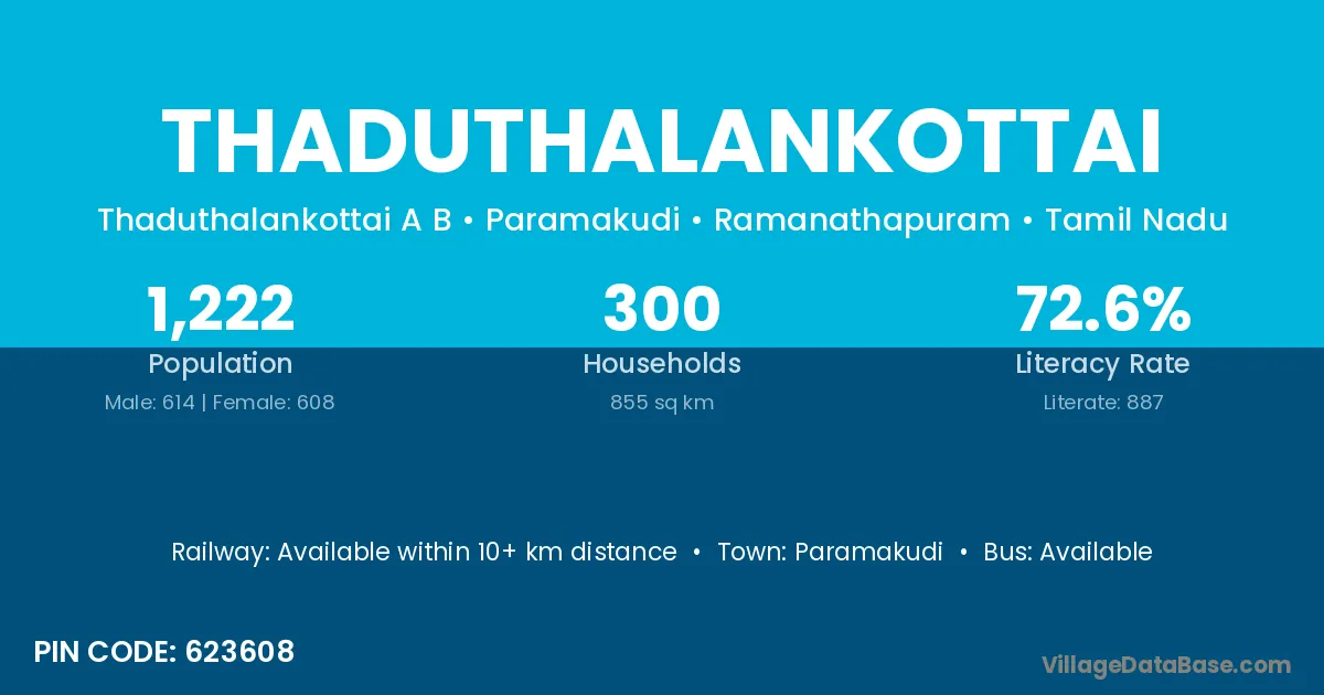 Thaduthalankottai village has a total population of 1,222 people, of which 614 are males and 608 are females.