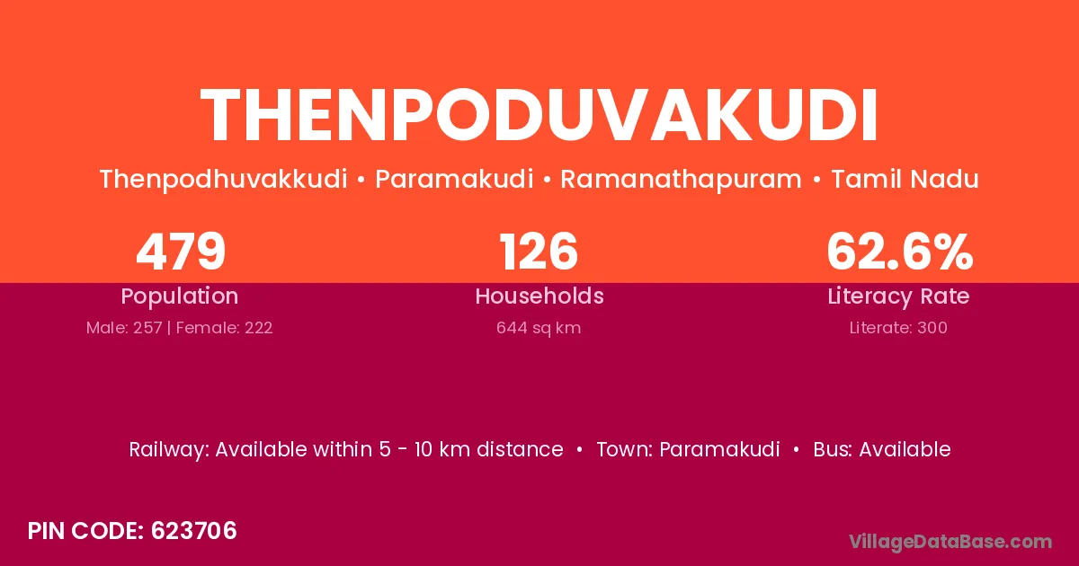 Thenpoduvakudi village has a total population of 479 people, of which 257 are males and 222 are females.