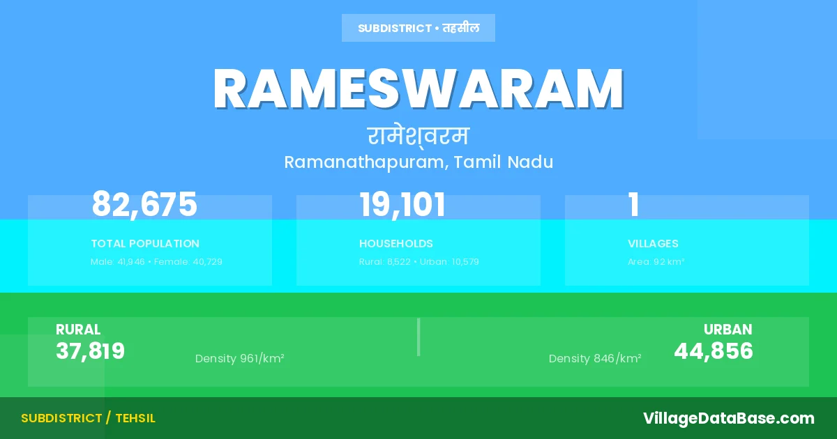 According to the 2011 census The total area of Rameswaram Taluka is 92 km², with a population of 82675 people. The population density is 895 inhabitants per square kilometre, and there are approximately 19101 houses in the sub district.