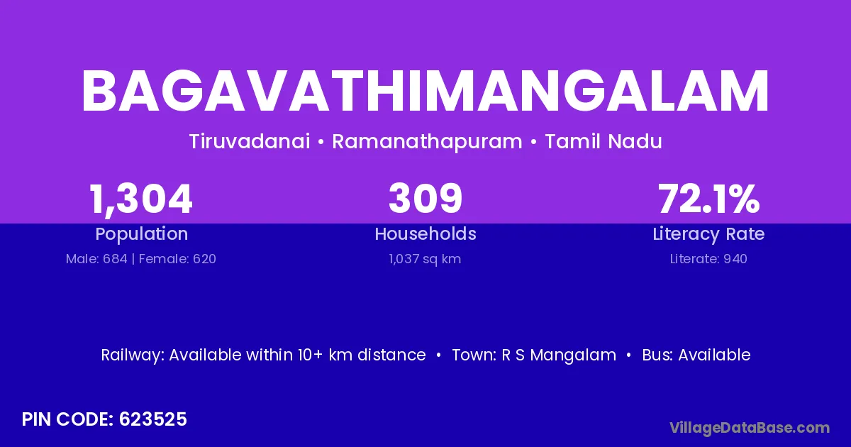 Bagavathimangalam village has a total population of 1,304 people, of which 684 are males and 620 are females.
