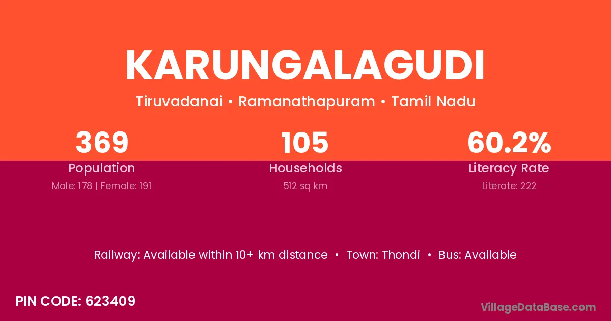 Karungalagudi village has a total population of 369 people, of which 178 are males and 191 are females.
