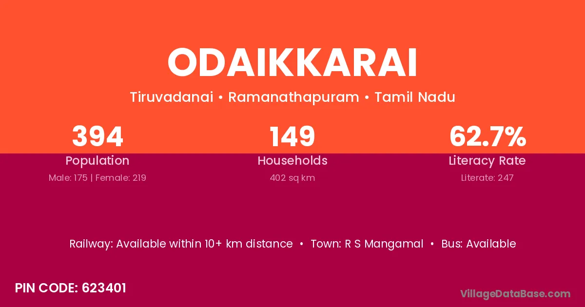 Odaikkarai village has a total population of 394 people, of which 175 are males and 219 are females.