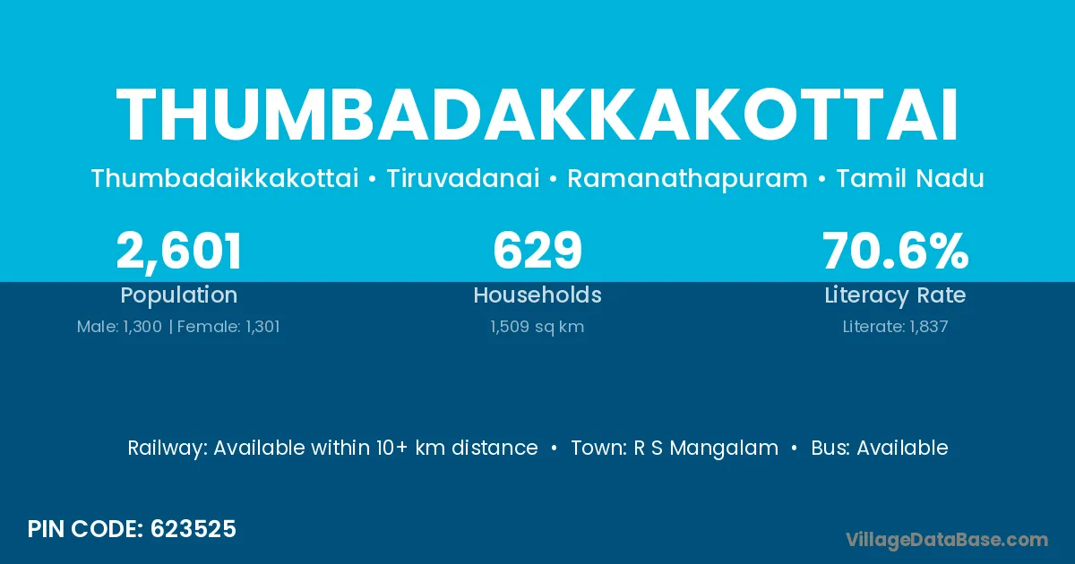 There are approximately 629 households in Thumbadakkakottai village.
