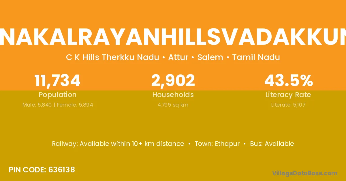 Chinnakalrayanhillsvadakkunadu village has a total population of 11,734 people, of which 5,840 are males and 5,894 are females.