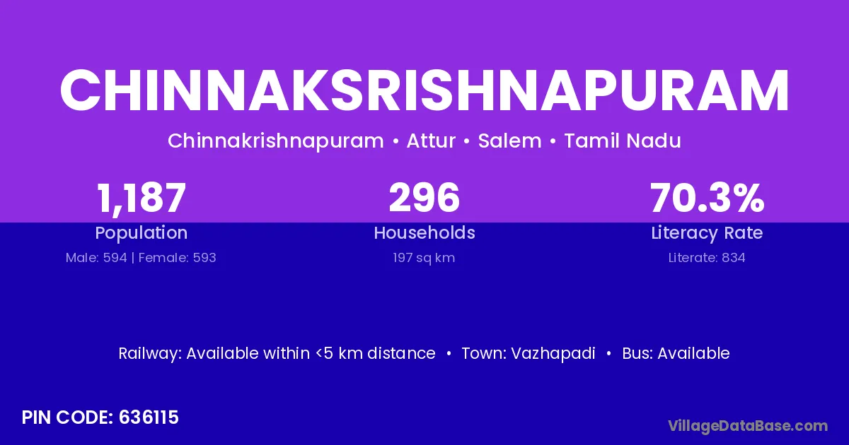 Chinnaksrishnapuram village has a total population of 1,187 people, of which 594 are males and 593 are females.