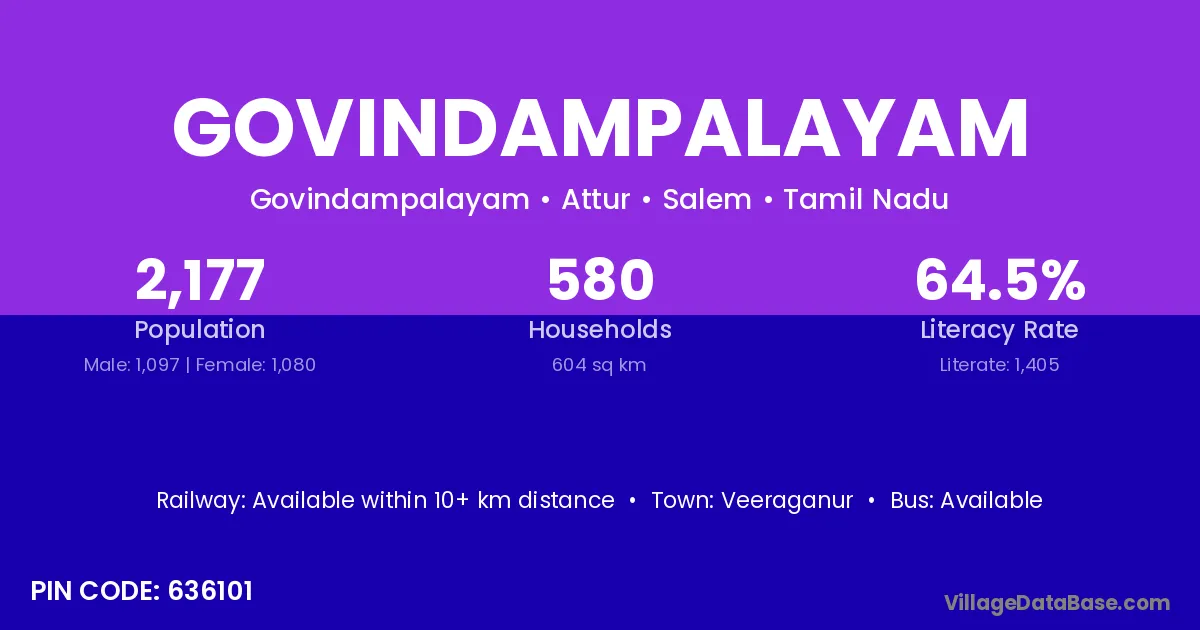 Veeraganur is the nearest town to Govindampalayam village for major economic activities