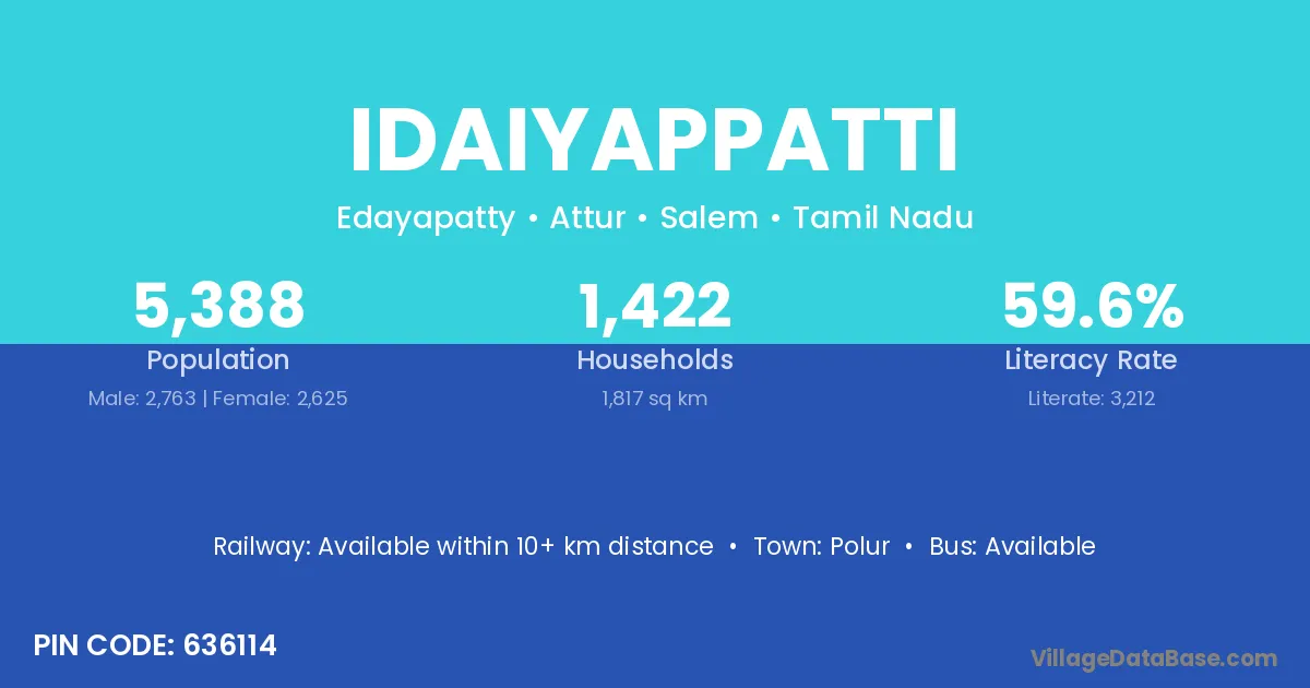 According to Census 2011 information, the village code of Idaiyappatti village is 636114.