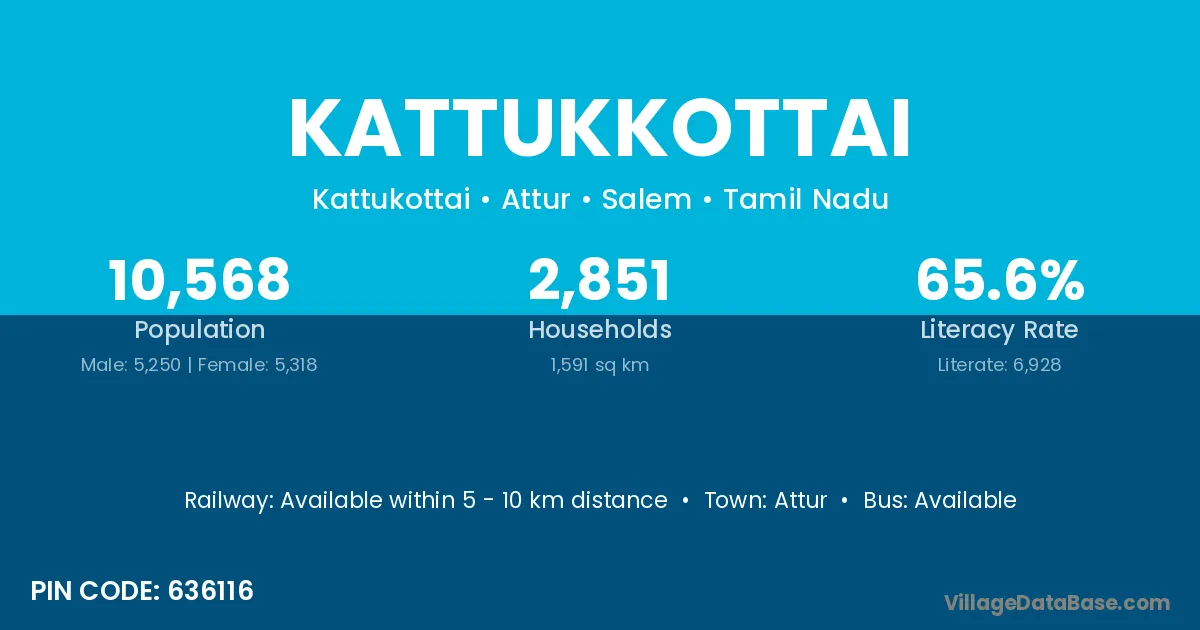 Kattukkottai village has a total population of 10,568 people, of which 5,250 are males and 5,318 are females.