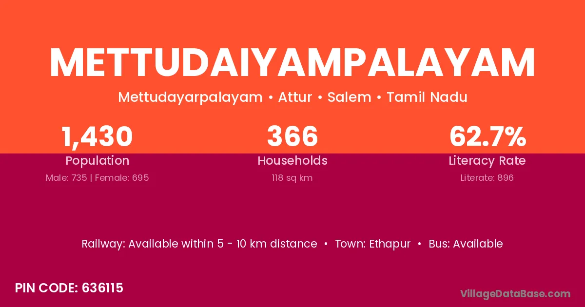 Ethapur is the nearest town to Mettudaiyampalayam village for major economic activities
