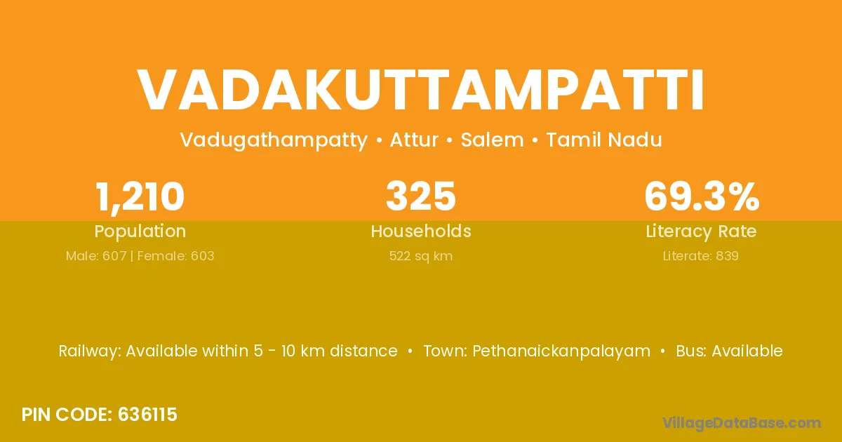 Vadakuttampatti village has a total population of 1,210 people, of which 607 are males and 603 are females.