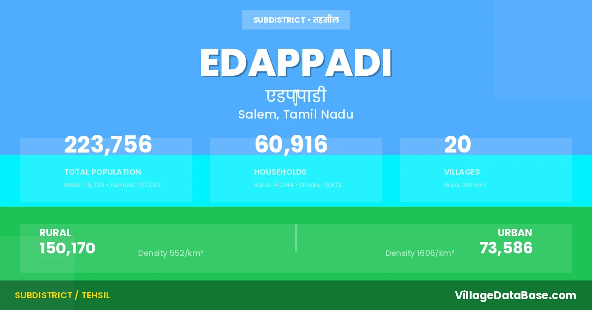 According to the 2011 census The total area of Edappadi Taluka is 318 km², with a population of 223756 people. The population density is 704 inhabitants per square kilometre, and there are approximately 60916 houses in the sub district.