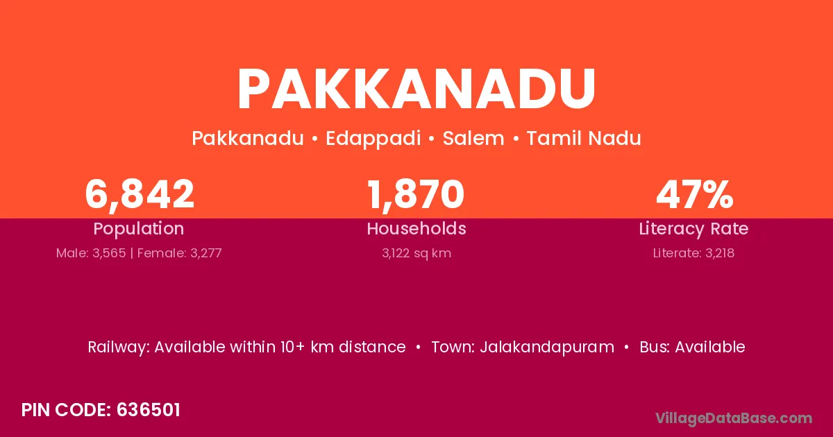 Pakkanadu village has a total population of 6,842 people, of which 3,565 are males and 3,277 are females.