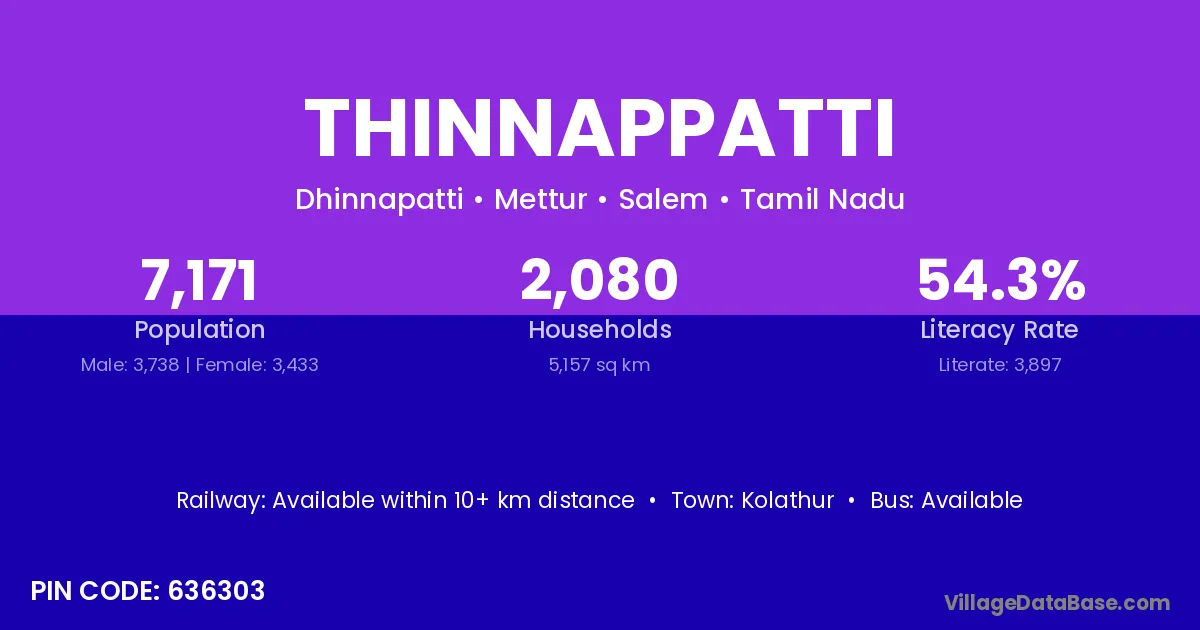 Thinnappatti village has a total population of 7,171 people, of which 3,738 are males and 3,433 are females.