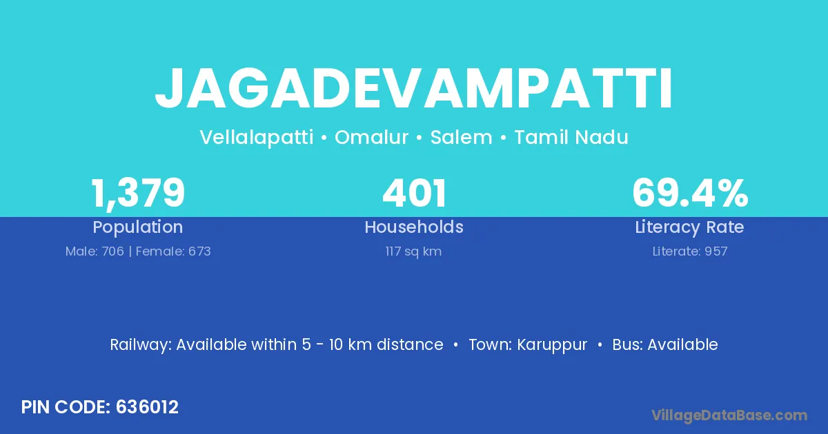Jagadevampatti village has a total population of 1,379 people, of which 706 are males and 673 are females.