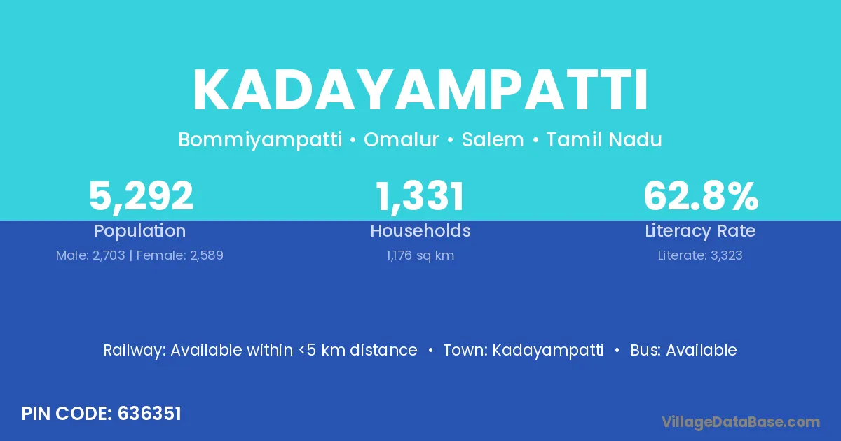 Kadayampatti village has a total population of 5,292 people, of which 2,703 are males and 2,589 are females.