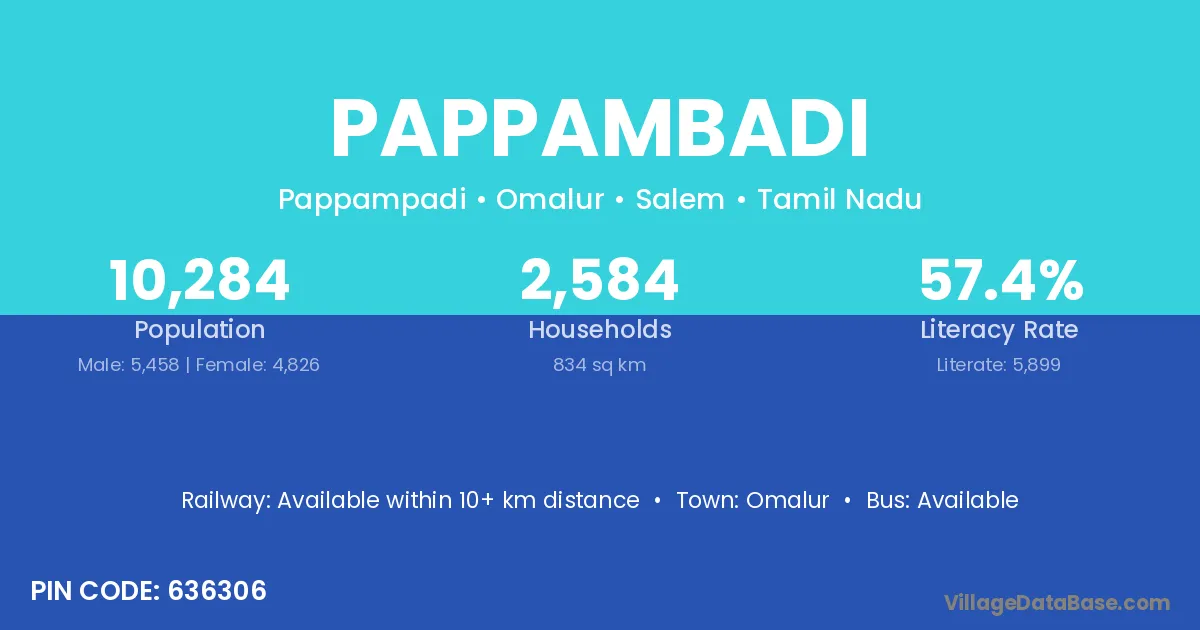 Pappambadi village has a total population of 10,284 people, of which 5,458 are males and 4,826 are females.