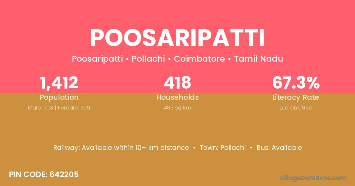 The literacy rate of Poosaripatti village is 63.58%. Male literacy stands at 72.21% and female literacy at 53.83%.