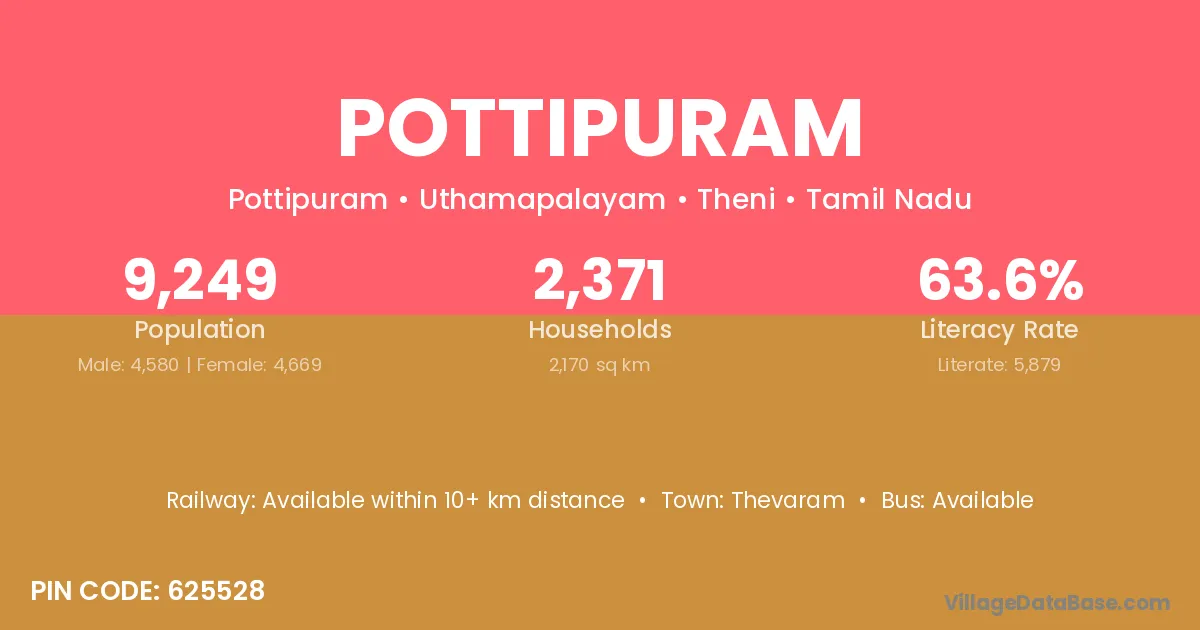 The literacy rate of Pottipuram village is 55.44%. Male literacy stands at 64.05% and female literacy at 45.72%.