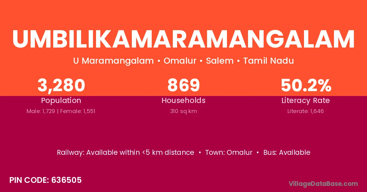 Umbilikamaramangalam village has a total population of 3,280 people, of which 1,729 are males and 1,551 are females.