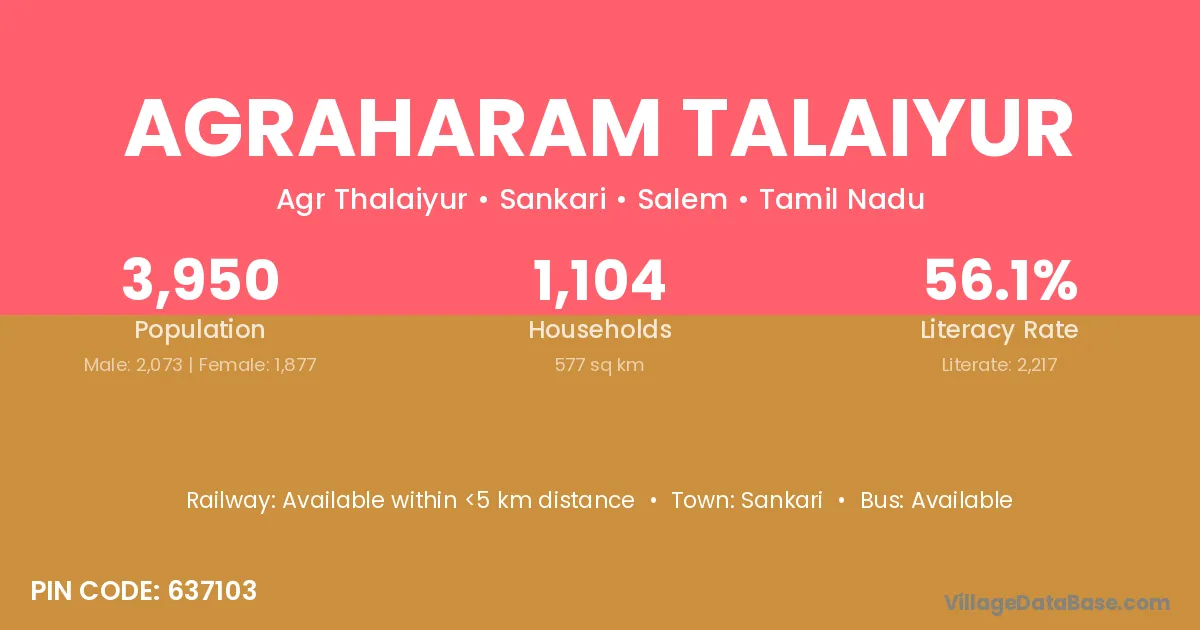 Sankari is the nearest town to Agraharam Talaiyur village for major economic activities