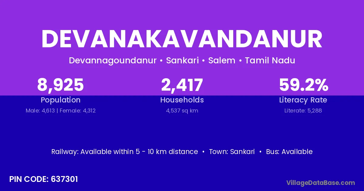 Sankari is the nearest town to Devanakavandanur village for major economic activities