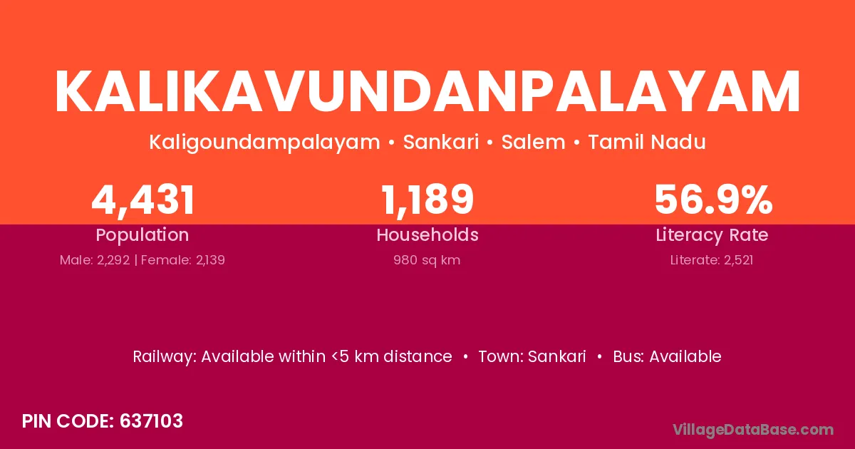 Kalikavundanpalayam village has a total population of 4,431 people, of which 2,292 are males and 2,139 are females.